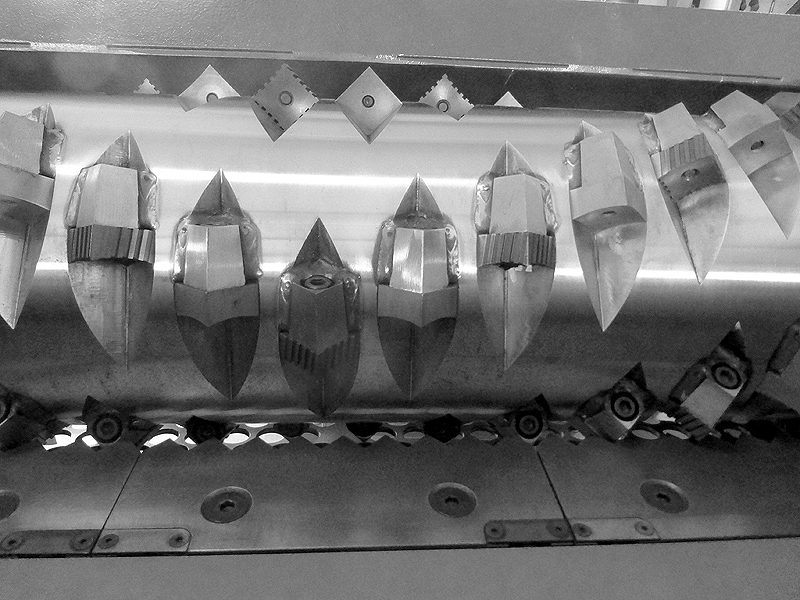 Genau so wenig, wie man unterschiedliche Speisen mit einer einheitlichen Gewürzmischung schmackhaft machen kann, genau so wenig sind alle Zerkleinerungsaufgaben mit ein und dem selben Schneidmesser zu bewältigen. Zur Differenzierung ist neben der richtigen Werkstoffauswahl in Verbindung mit der angepassten Wärmebehandlung, primär die Schneidengeometrie eines Messers ausschlaggebend dafür, welche Ausbringungsmenge erreichbar ist, welche Qualität das Mahlgut hat, welche Antriebsleistung durch die Maschine erbracht werden muss und welches Standzeitverhalten pro Schneide zu erwarten ist. In manchen Fällen ist es aber nicht möglich, mit der Wahl eines bestimmten Messers, die für den Zerkleinerungsprozess optimalen Bedingungen zu schaffen. In solchen Situationen empfiehlt sich eine Kombination der ausgewählten Messer mit Messern entsprechend unserem CROSS CUT-System. CROSS CUT steht für aggressives Schneidverhalten bei weniger Energiebedarf, in Verbindung mit hoher Durchsatzleistung, hervorragendem Standzeitverhalten und lagerschonender Laufruhe des Rotors. Die angesprochene Kombination sollte im wechselweisem Einbau passieren, wie auf den beiden Fotos zu sehen ist. Messer nach dem CROSS CUT-System gibt es unabhängig von der Formgestaltung, also ganz gleich ob quadratisch, rechteckig, trapezförmig oder rund. Der wechselweise Einbau hat nebenbei auch noch einen wirtschaftlichen Effekt. So können die Messerbeschaffungskosten für die in der Regel teureren (weil aufwändiger in der Herstellung) CROSS CUT Messer halbiert werden und trotzdem ein Optimum an Effektivität beim Zerkleinerungsprozess erzielt werden.
